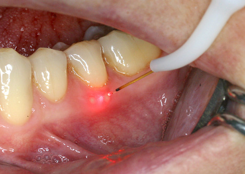 Cette biostimulation qui peut durer plusieurs minutes aboutit en général à une guérison très rapide et indolore des ulcérations gingivales (fig. 22)
